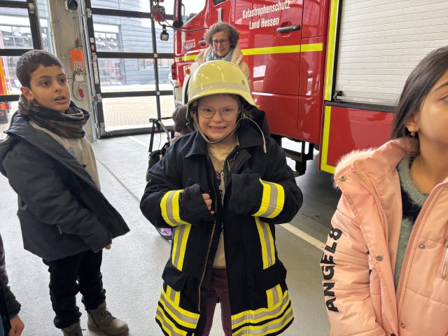 Dort wurde ihnen gezeigt wie ein Feuerwehrmann sich bei einem Alarm anziehen muss oder aber was sich alles in so einem Feuerwehrauto versteckt.