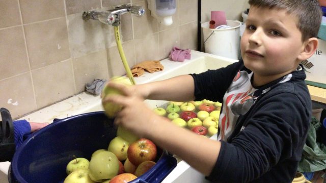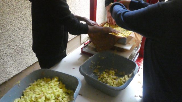 An verschiedenen Stationen wurden die Äpfel zunächst gewaschen, dann geschnitten und im Anschluss gehäckselt.