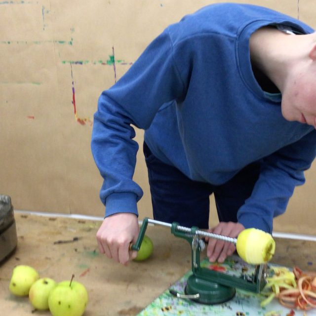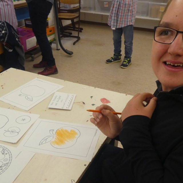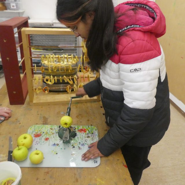 Neben den Stationen für das Apfelsaftpressen konnten die Lernenden an weiteren Stationen Apfelringe zum Dörren herstellen, Stofftaschen mit Apfeldruck bedrucken, Bilder zum Thema Apfel bemalen oder ein Heft „Vom Apfel zum Apfelsaft“ basteln.